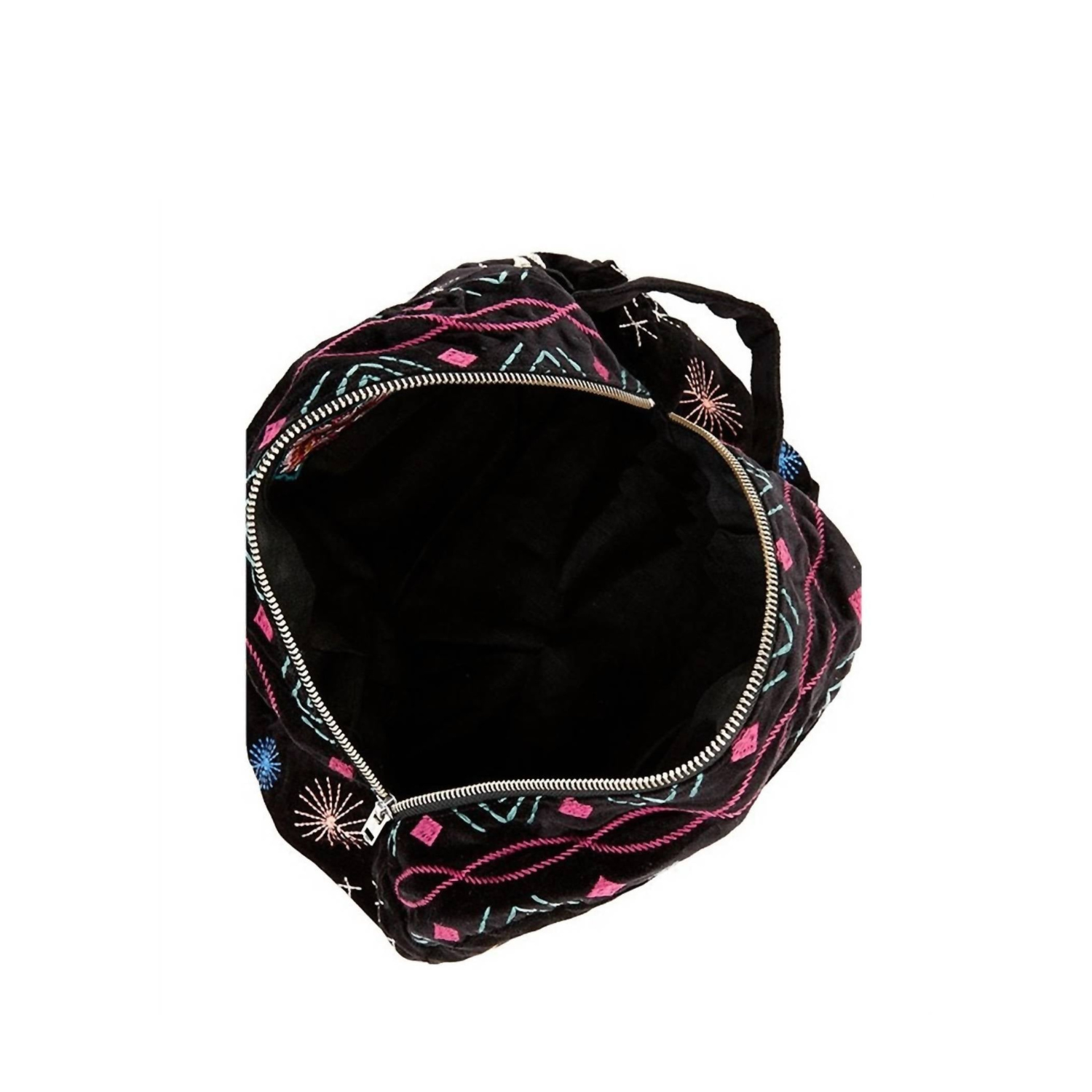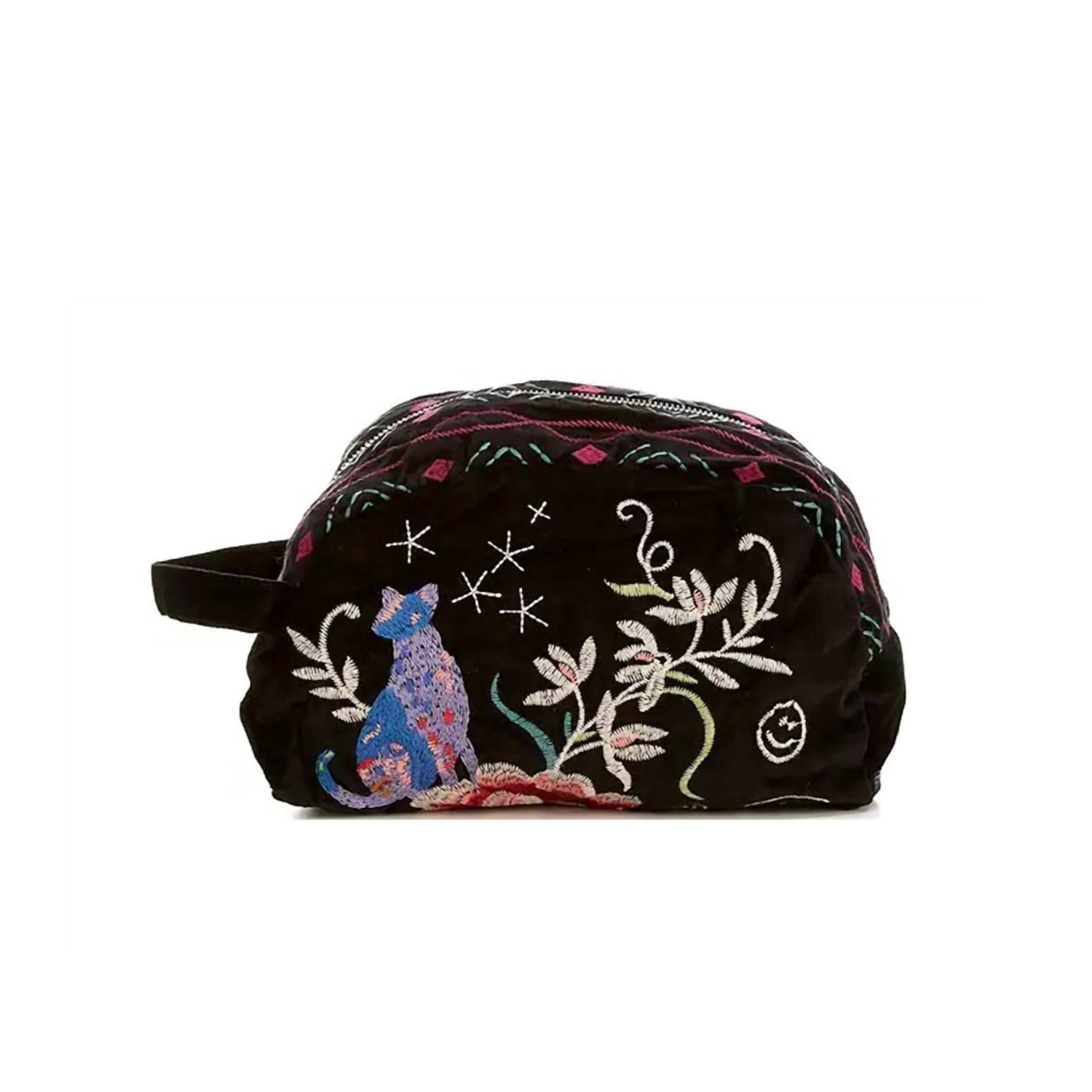 Introducing the Colette Velvet Makeup Bag by Johnny Was, a chic and durable organizer crafted from 100% cotton. This spacious bag measures 10.5"L x 5"W x 6.7"H, with intricate Hawaiian embroidery that adds a touch of elegance. It features a zip-around closure and a convenient wrist strap, perfect for easy carriage. Care Instructions: Dry clean only.