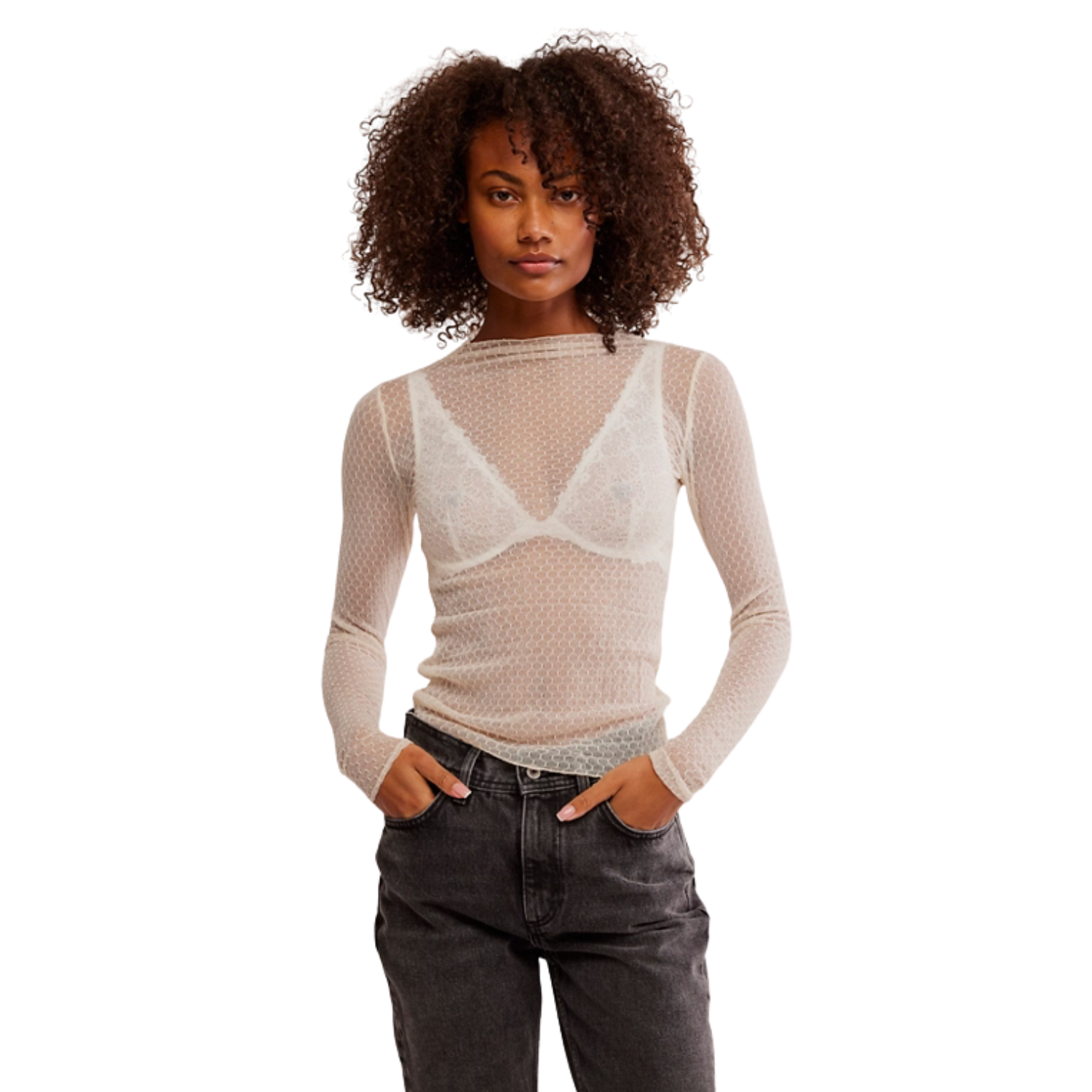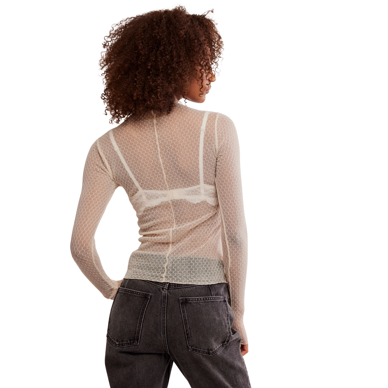 Perfect for layering, this sultry mesh long-sleeve features a honeycomb inspired design with , a mock neckline, and thumbhole details.