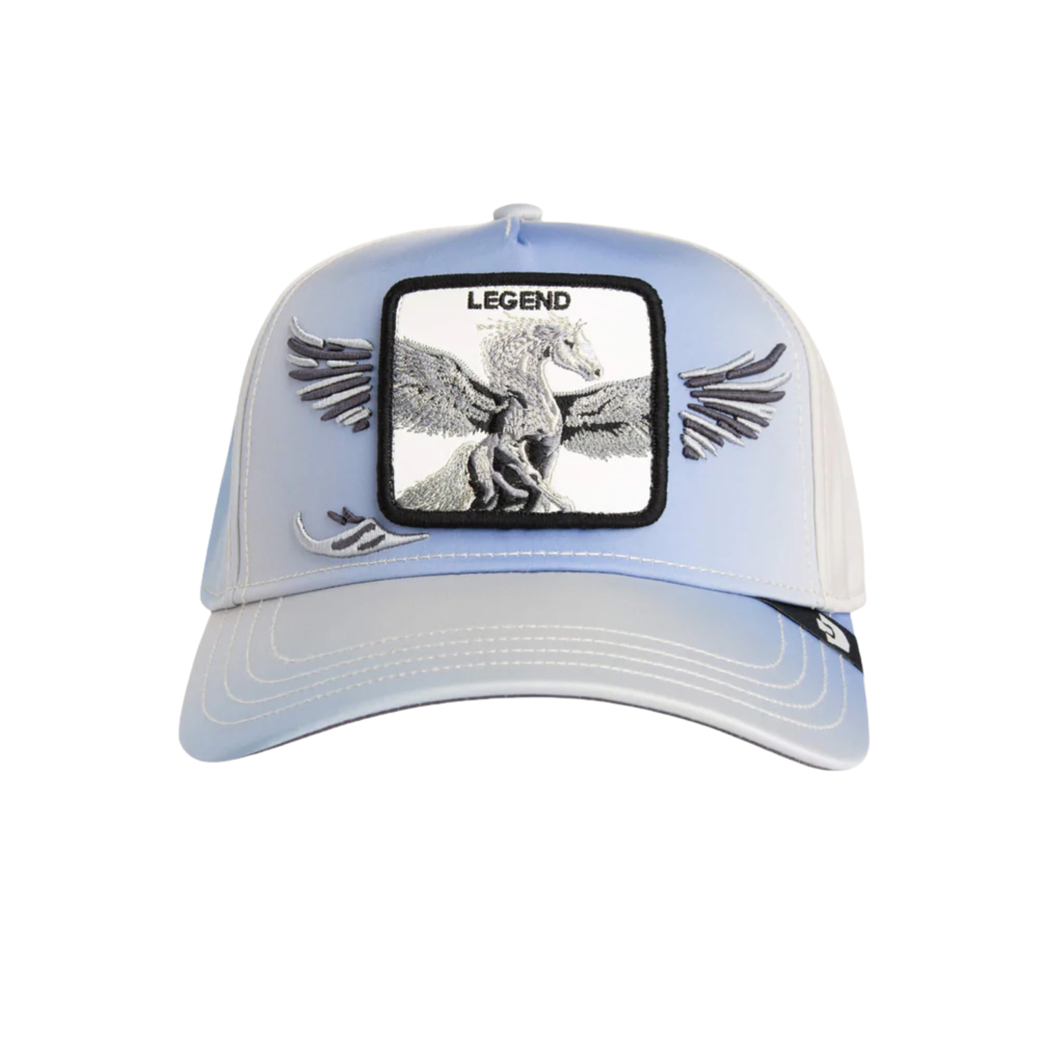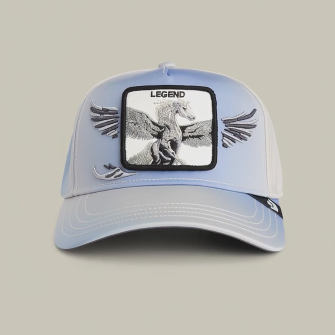Pegasus mid-flight, breaking boundaries with wings that don’t know borders. Cool silver fade, heavy contrast stitching, and a patch that can’t contain the legend. Elevation, stitched.