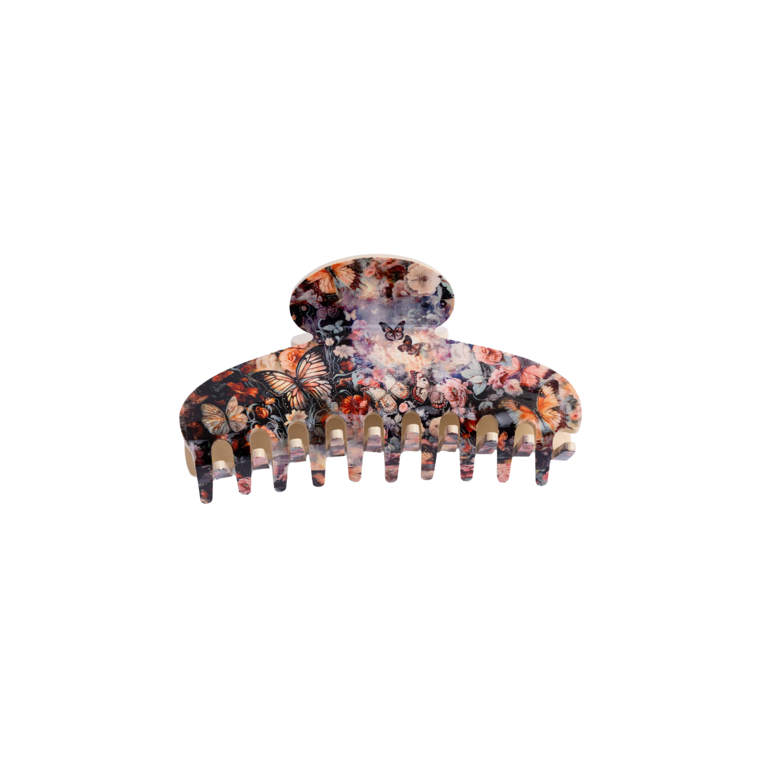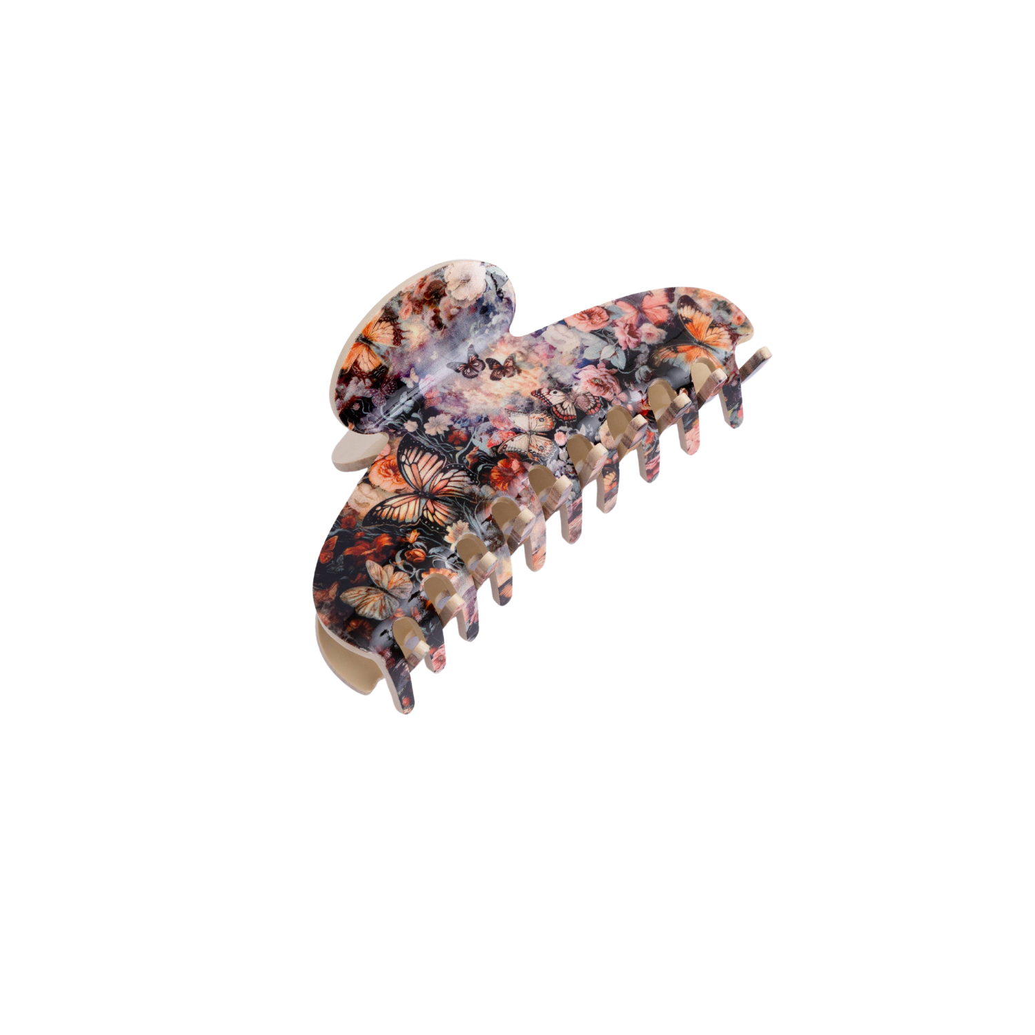 Featuring bold images of colorful florals and butterflies in flight, the Teyros Hairclip elevates your casual style. Crafted from a durable material with a glossy finish, this playful accessory is equal parts functional and fun. This clip perfectly pulls up the sides of your hair or adds the finishing touch to a loose chignon twist.