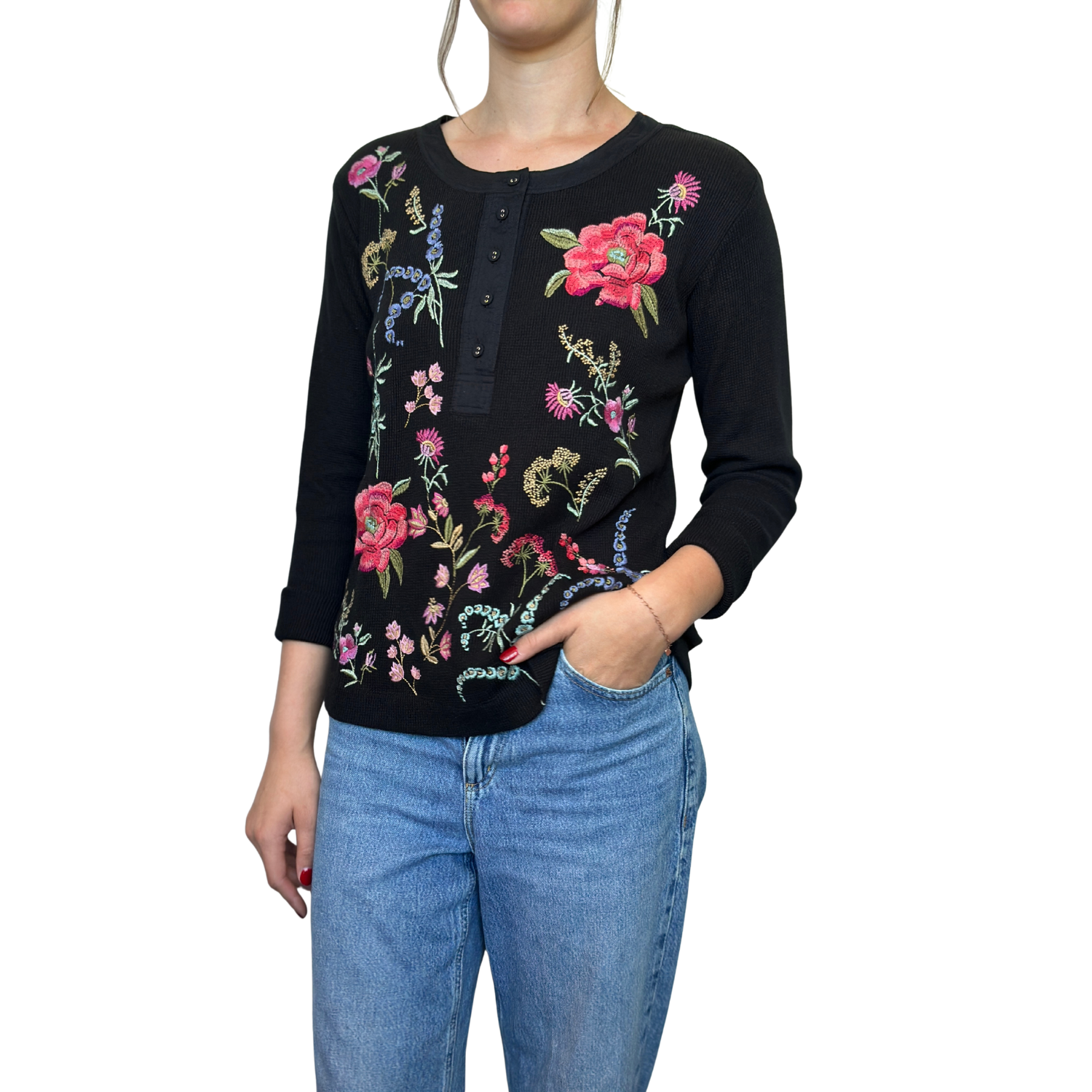 Beautifully embellished with colorful floral embroidery detailing, the Mixed Media Henley Thermal offers a fresh take on a traditional wardrobe staple. Crafted from a cotton blend, this casual top features a Henley neckline and long sleeves and is finished with a straight hemline. Pair with cargo joggers and fashion sneakers for a fresh weekend look.