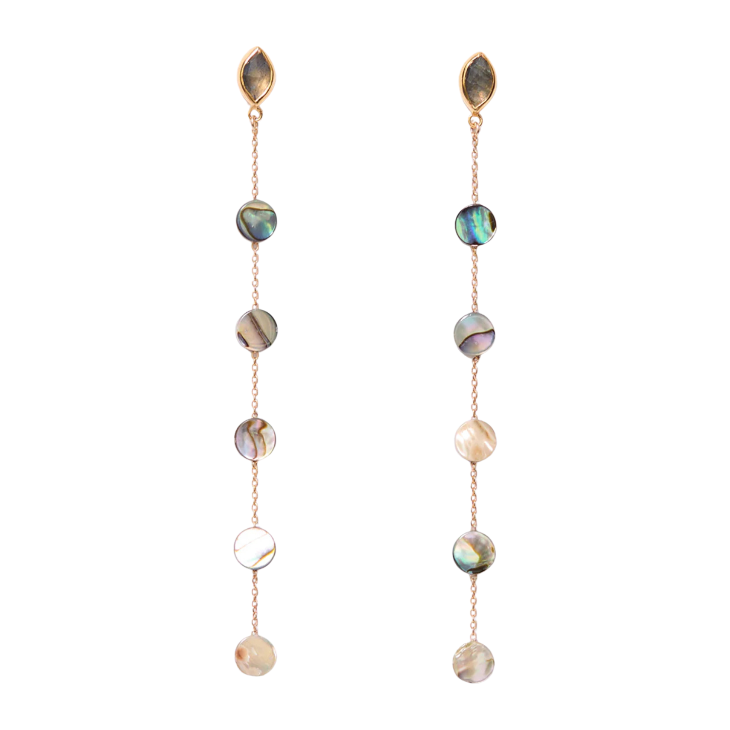 The Gwen Earring features labradorite marquise posts and abalone circles dotted along dainty gold chain.