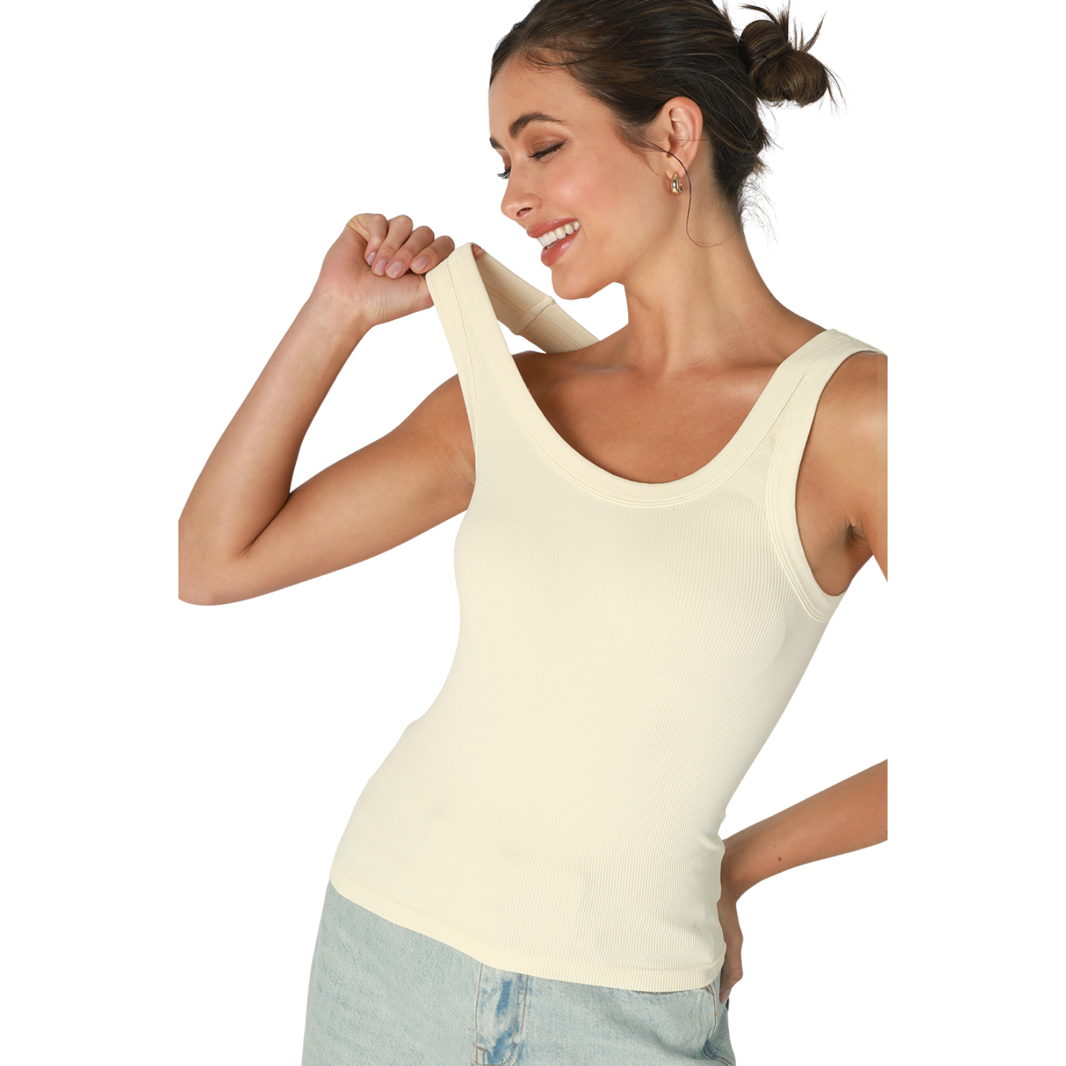 A reversible ribbed knit tank top that can be worn as a scoop neck