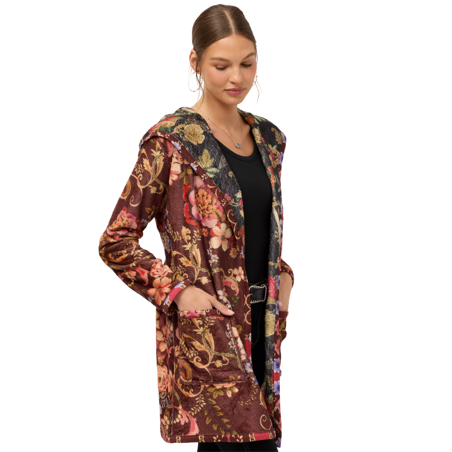 The fully reversible Joan Midi Sherpa Jacket offers two bold floral patterns to choose from, making it a versatile wardrobe addition. Designed with an open front with an attached hood, this cozy jacket is finished with patch pockets at the hips. Layer over a sleek turtleneck and pair with cigarette pants for an elevated casual ensemble.