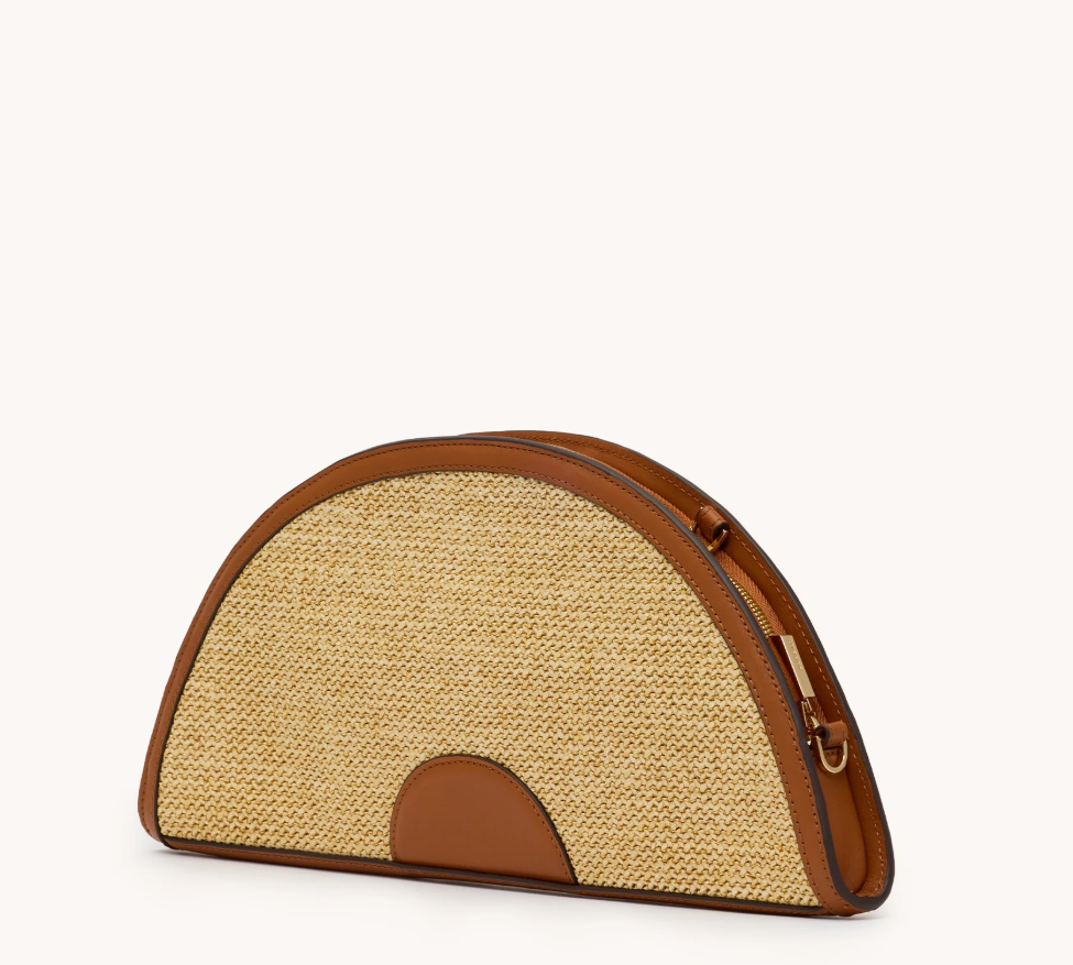 - Crafted with a combination of chaparral raffia, medium tone tan brown pebbled leather and mosaic brown pebbled leather
