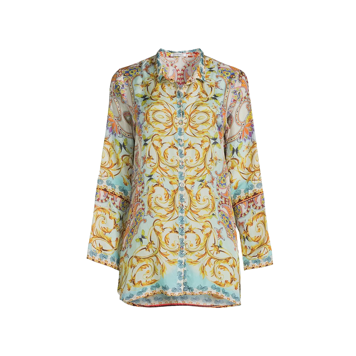 Crafted of lightweight silk, the Indy tunic from Johnny Was is styled with an intricate filigree print.