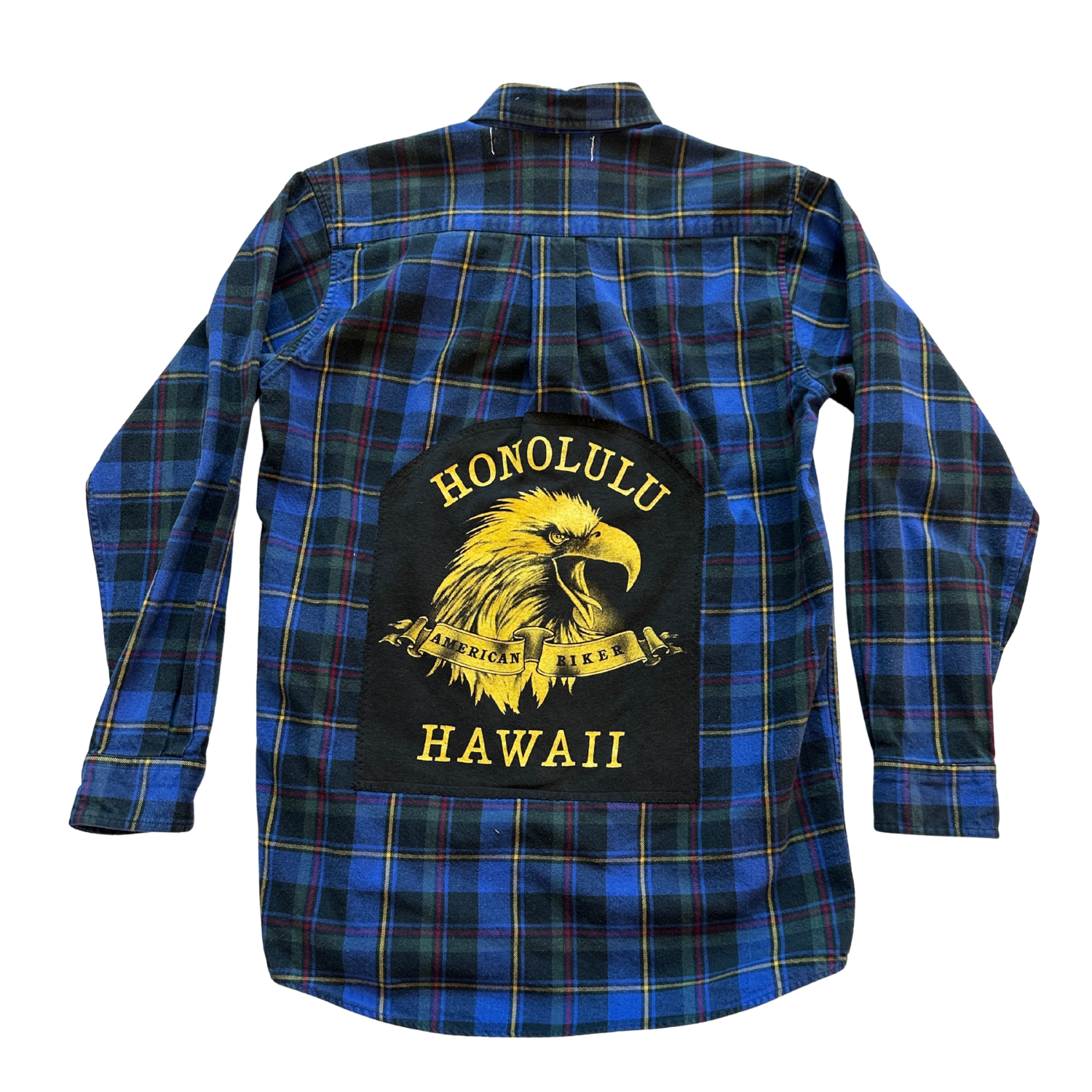 Each piece is a custom, one-of-a-kind flannel shirt, sourced and then reworked with authentic vintage graphics stitched onto the back.