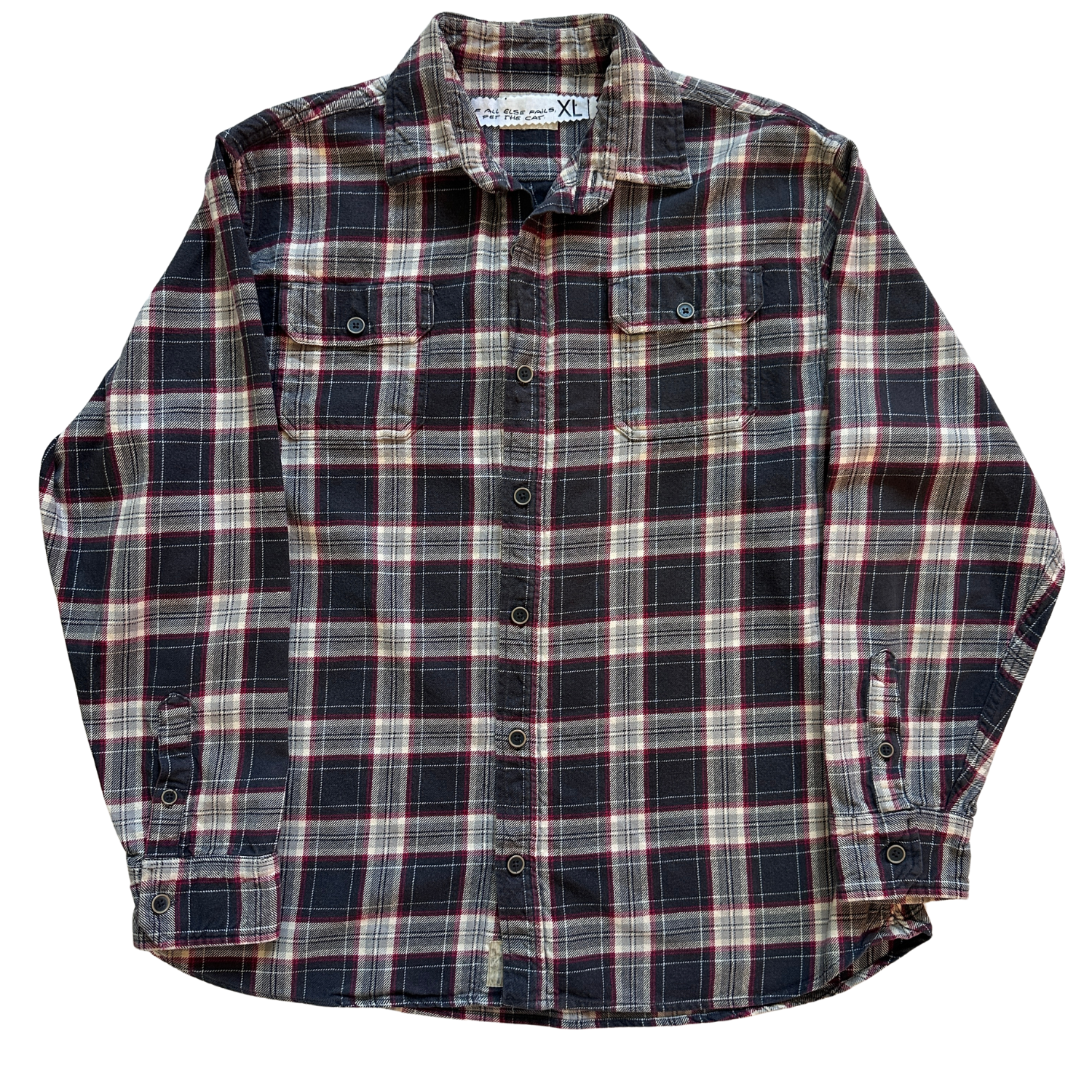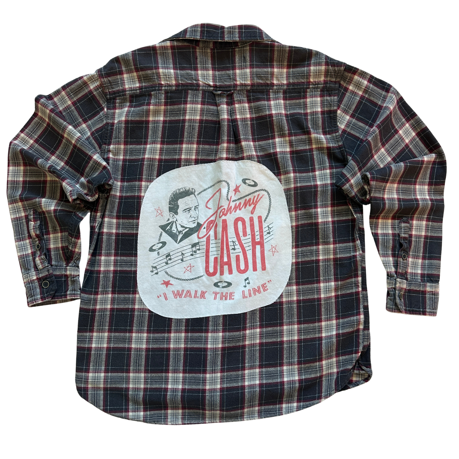 Each piece is a custom, one-of-a-kind flannel shirt, sourced and then reworked with authentic vintage graphics stitched onto the back.
