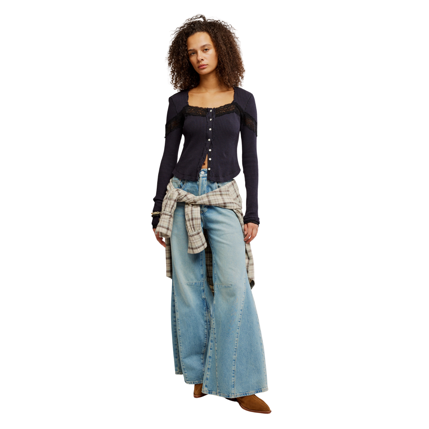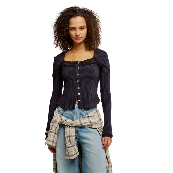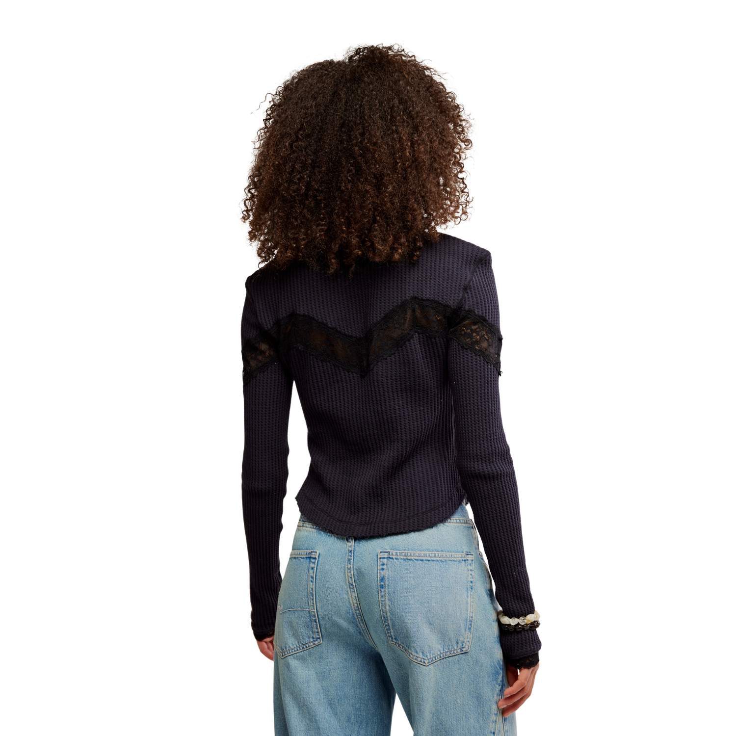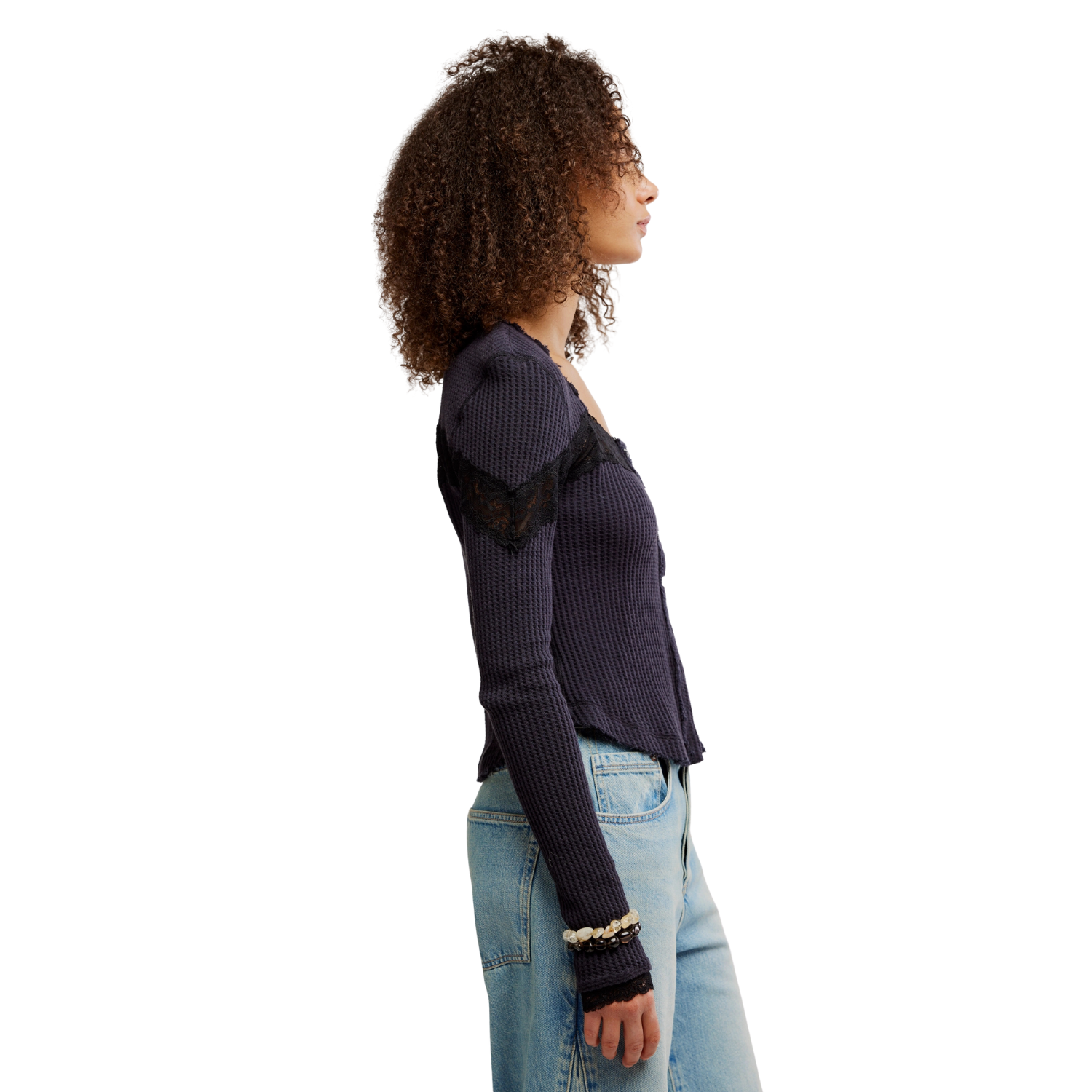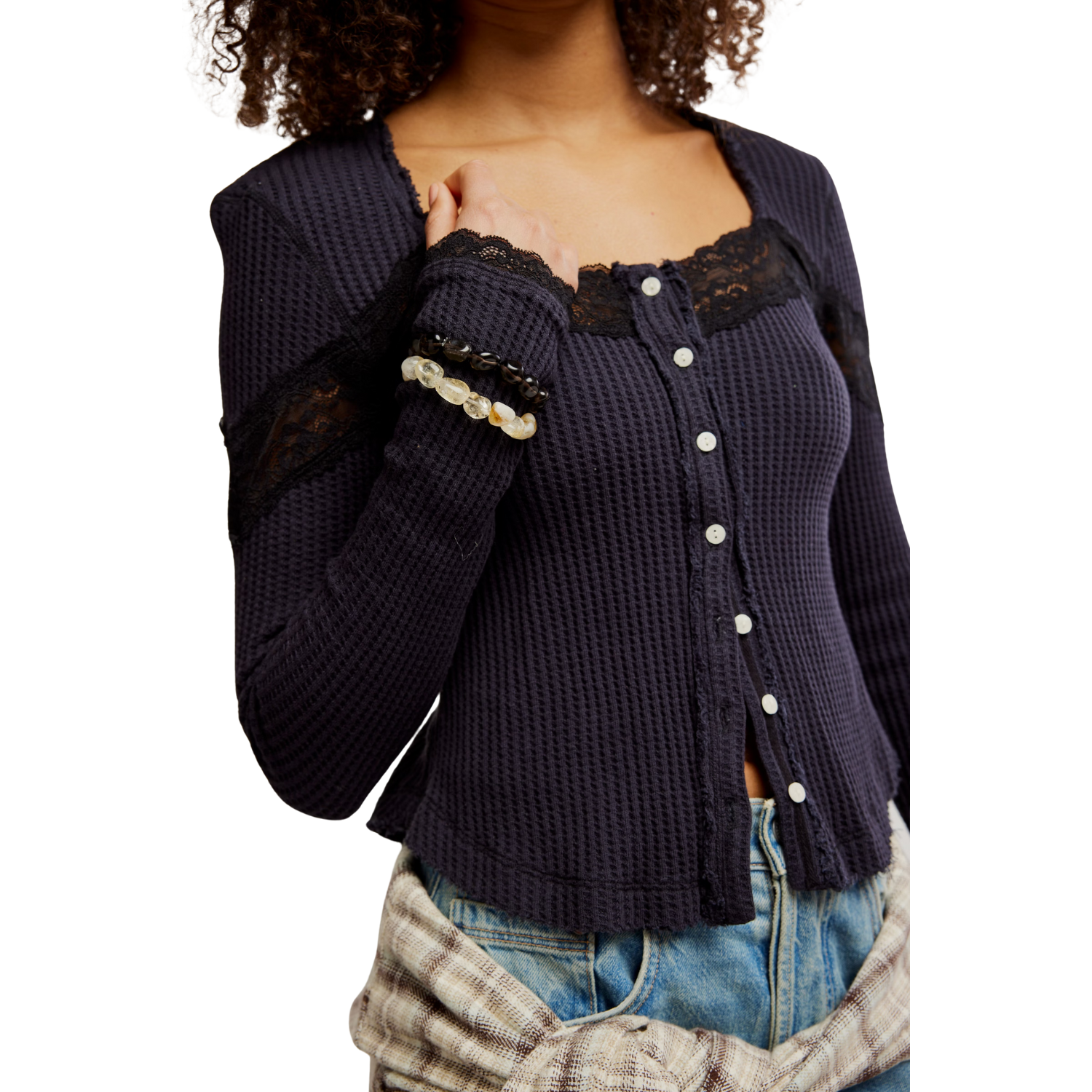Lace trims give this waffle-knit cardigan the perfect femme touch.