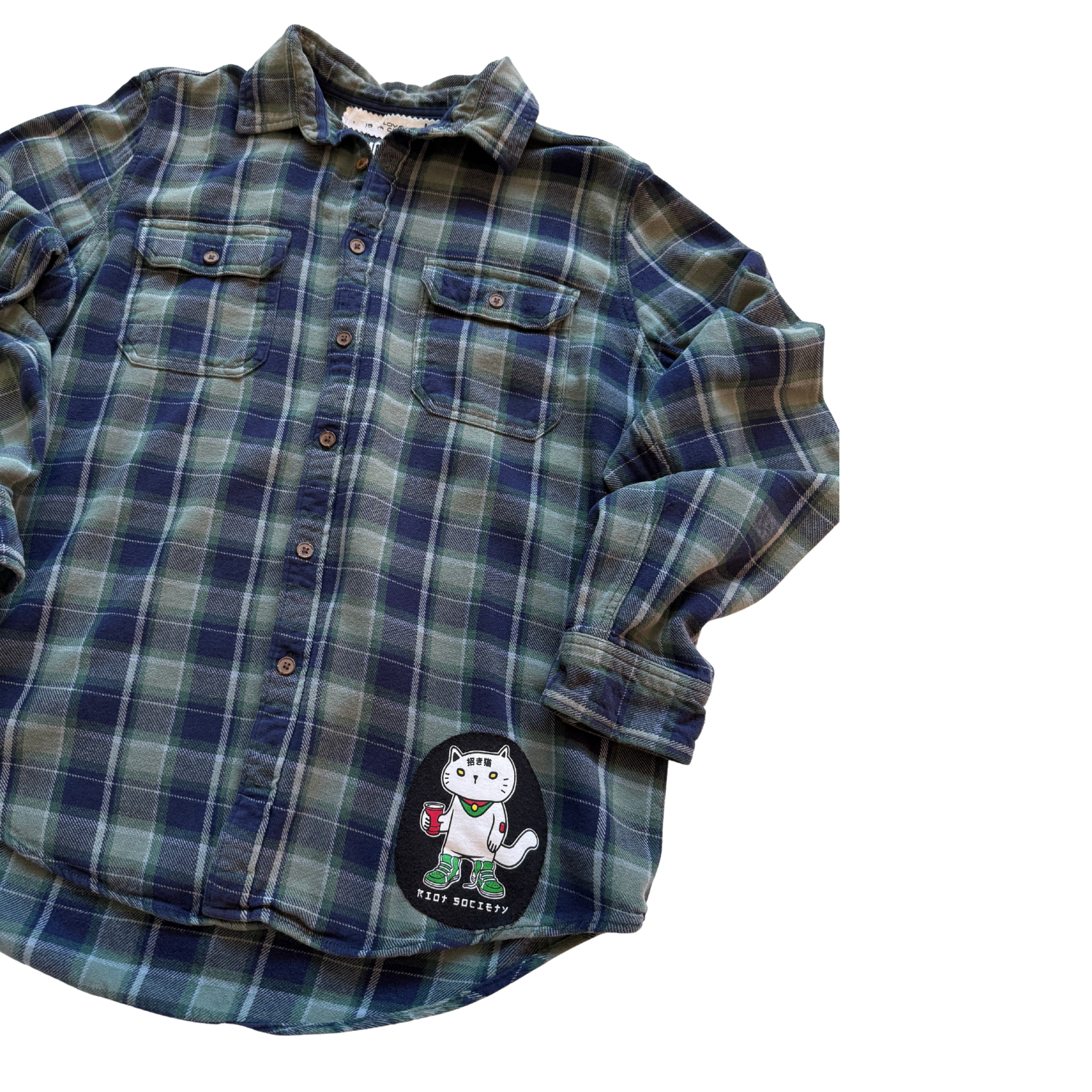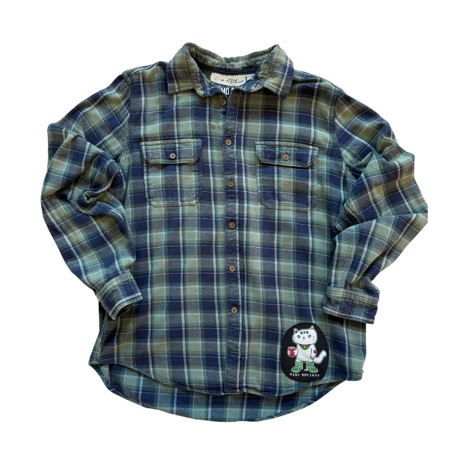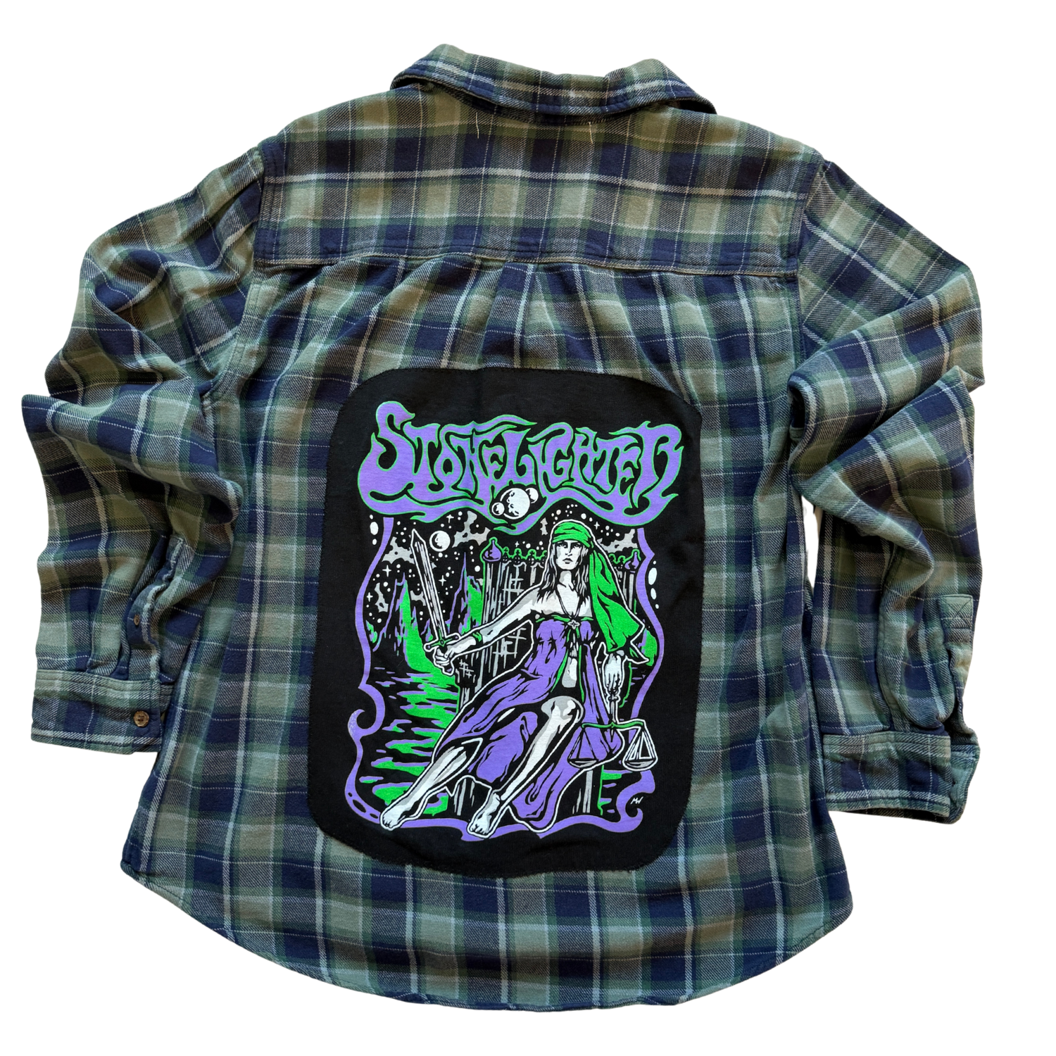 Each piece is a custom, one-of-a-kind flannel shirt, sourced and then reworked with authentic vintage graphics stitched onto the back.